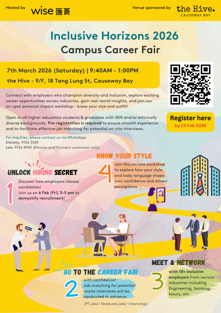· Wise will share the available job opportunities that will be featured at the career fair soon. First-round of interview would be available for some companies. Pre-registration is required to ensure smooth experience and to facilitate effective job matching for potential on-site interviews. · Wiseanticipate having around 10 prominent employers setting up booths at the event, which may include notable names such as HSBC, CLP, Louis Vuitton, Generali, HK Jockey Club, EY, Arup, Accenture, and others. In addition, the Selective Placement Division of Labour Department and the Equal Opportunities Commission will participate as exhibitors, offering valuable support and resources to students. · To help sutdents understand how employers select candidates. A essential workshop: Career Prep Lab reveals current market trends, explains why employers rely on aptitude tests and what they truly seek in candidates, and breaks down the full recruitment process. Gain practical tips and strategies to perform at your best, understand realistic employer expectations, and learn how to confidently request test accommodations. The workshop will be held by WISE on 6 February, 2026 (Friday) during 3:00 PM - 5:00PM at Admiralty. To sign up, please indicate your interest in the same form above by 1 Feb 2026 (Sunday). · Poster of the Campus Career Fair |